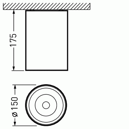 Gehäuse und Kühlkörper aus Aluminium-Druckguss. Oberfläche weiß beschichtet (RAL 9016). Leuchtendurchmesser Ø 149 mm, Leuchtenhöhe 175 mm. Schutzklasse (EN 61140): I, Schutzart (DIN EN 60529): IP20, Stoßfestigkeitsgrad nach IEC 62262: IK06, Prüftemperatur Glühdrahttest gemäß IEC 60695-2-11: 850 °C. Gewicht: 1,9 kg.